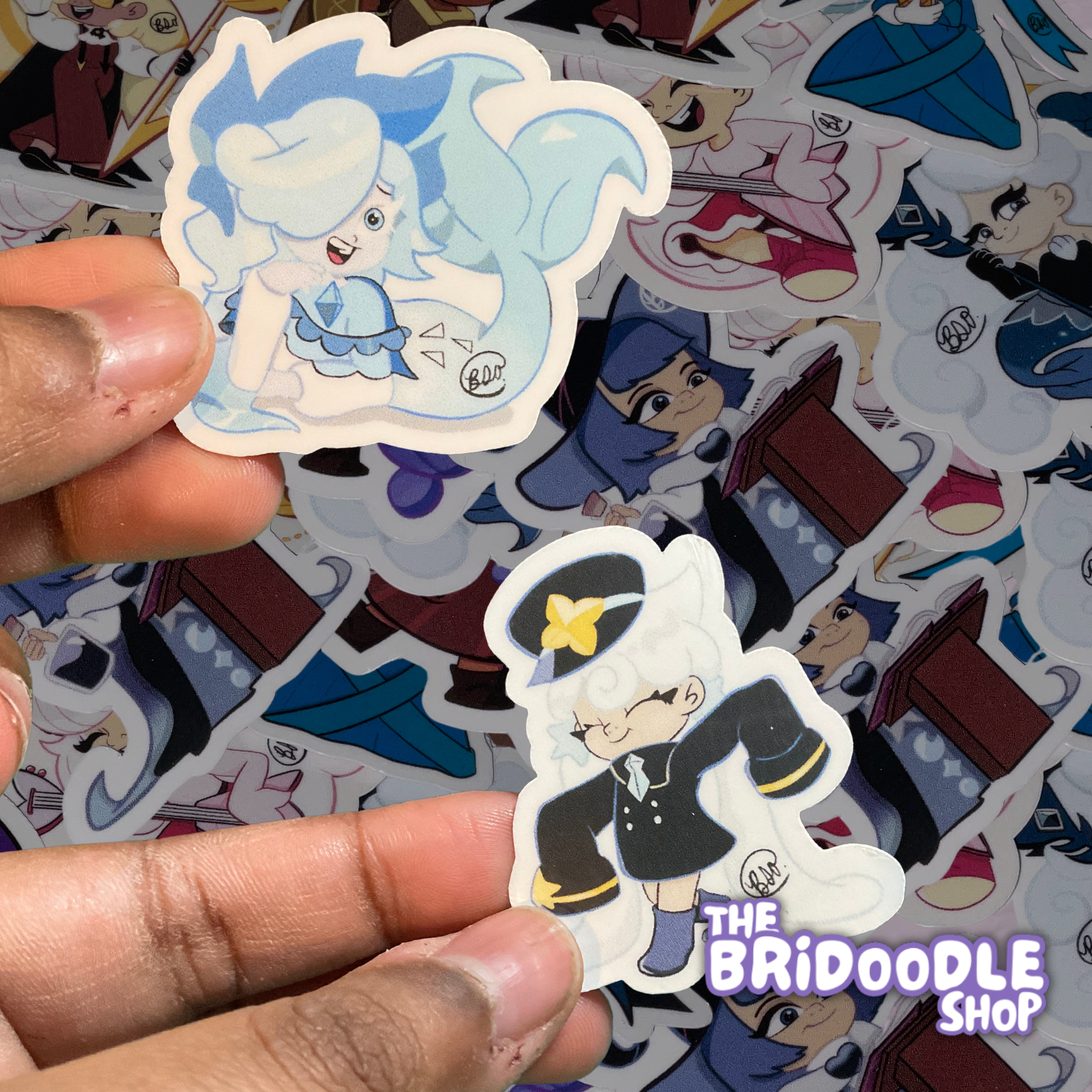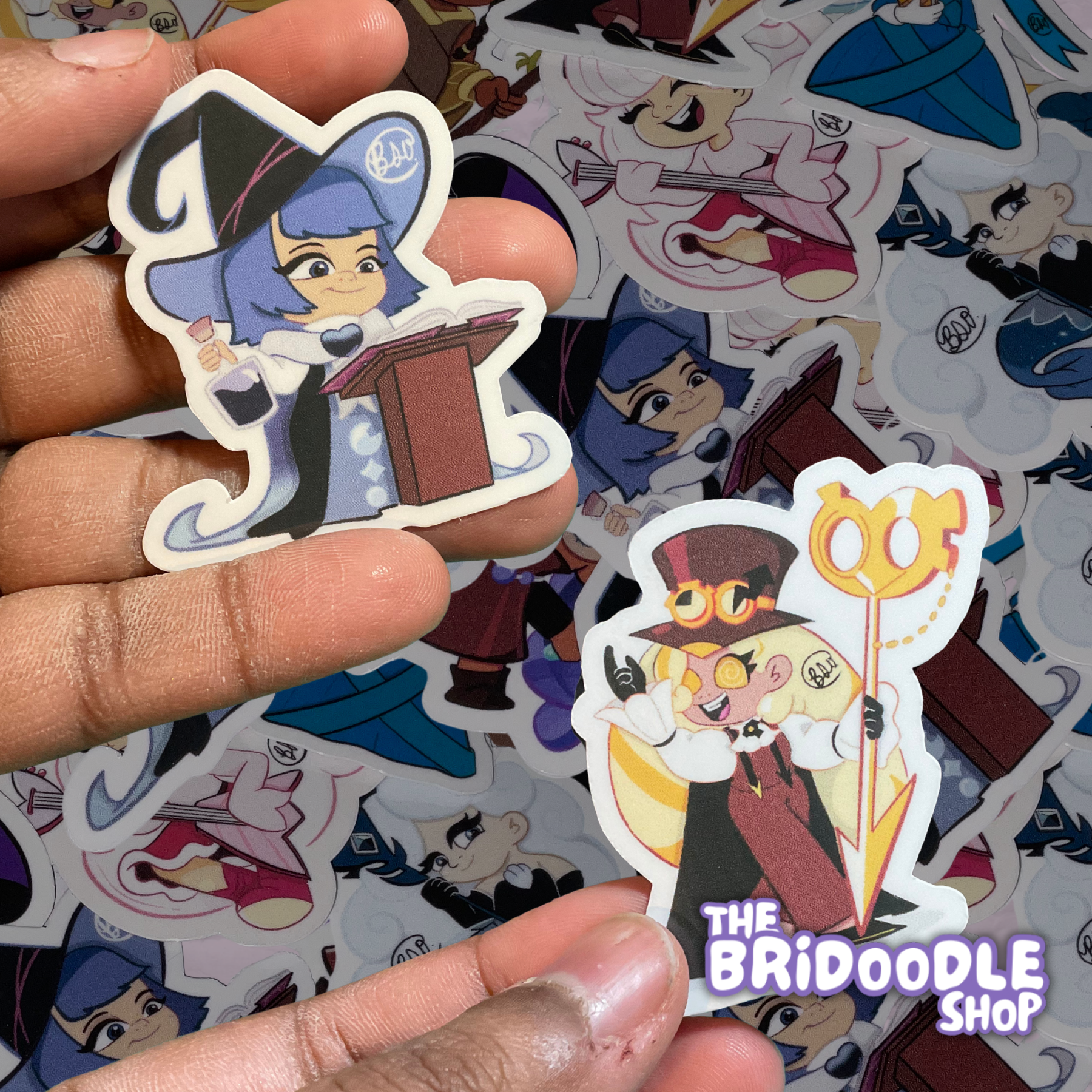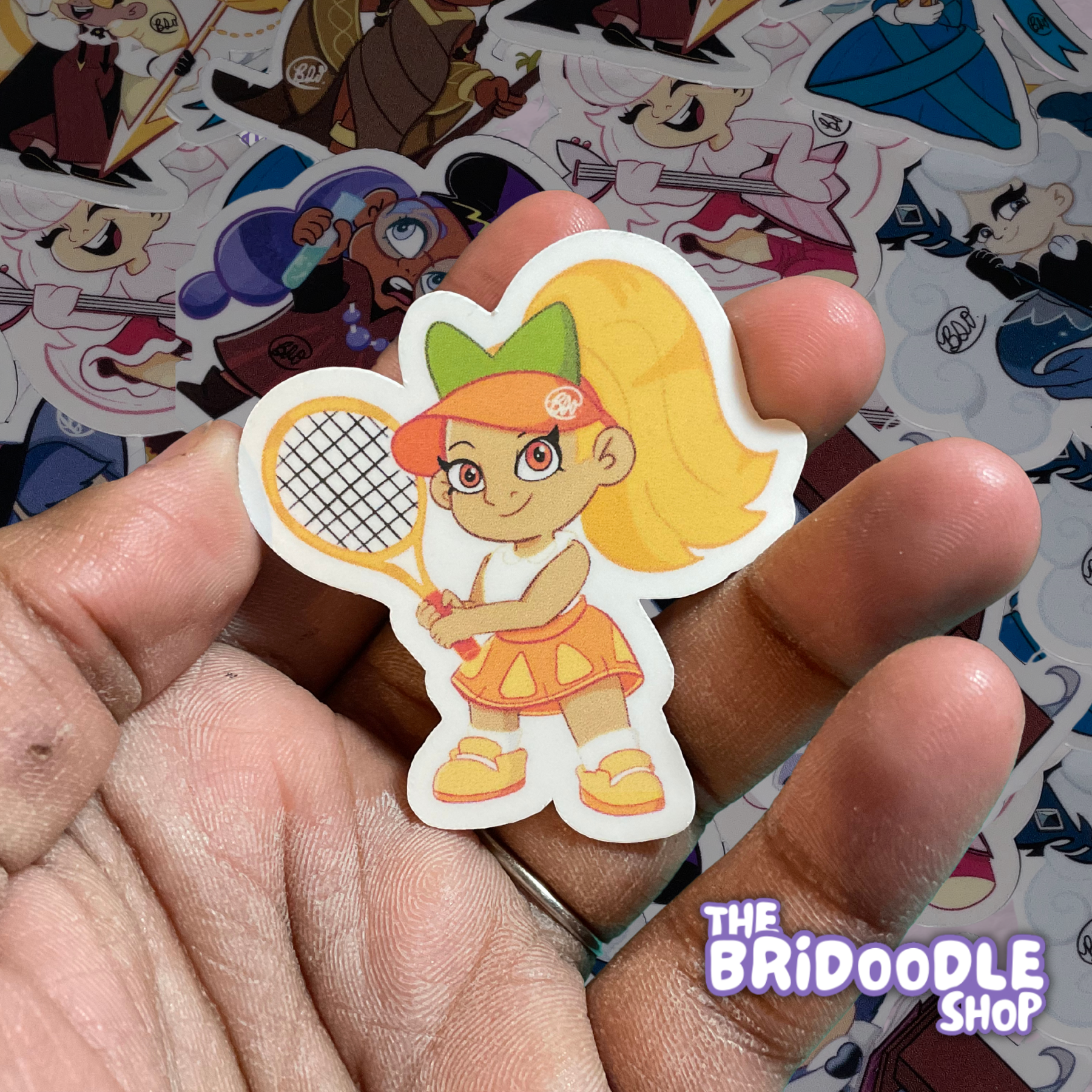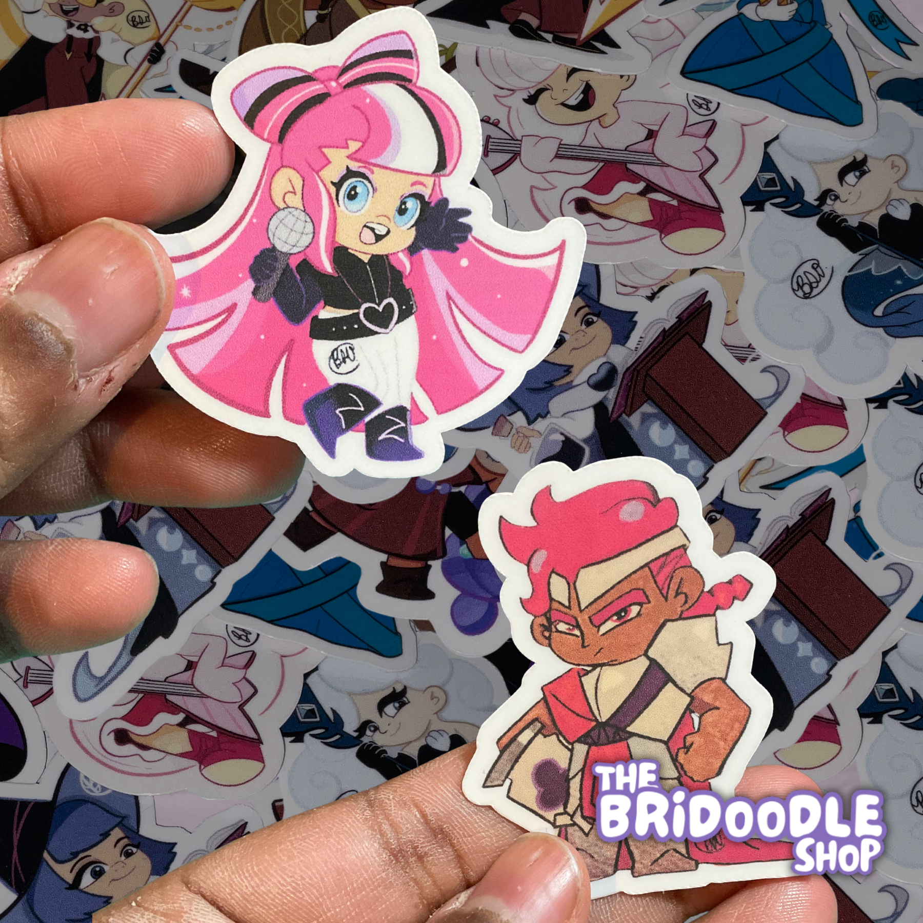 Bright, colorful, beautifully illustrated vinyl stickers, 3D printed keychains each having a special design, and buttons with characters and fun colorful personalities.